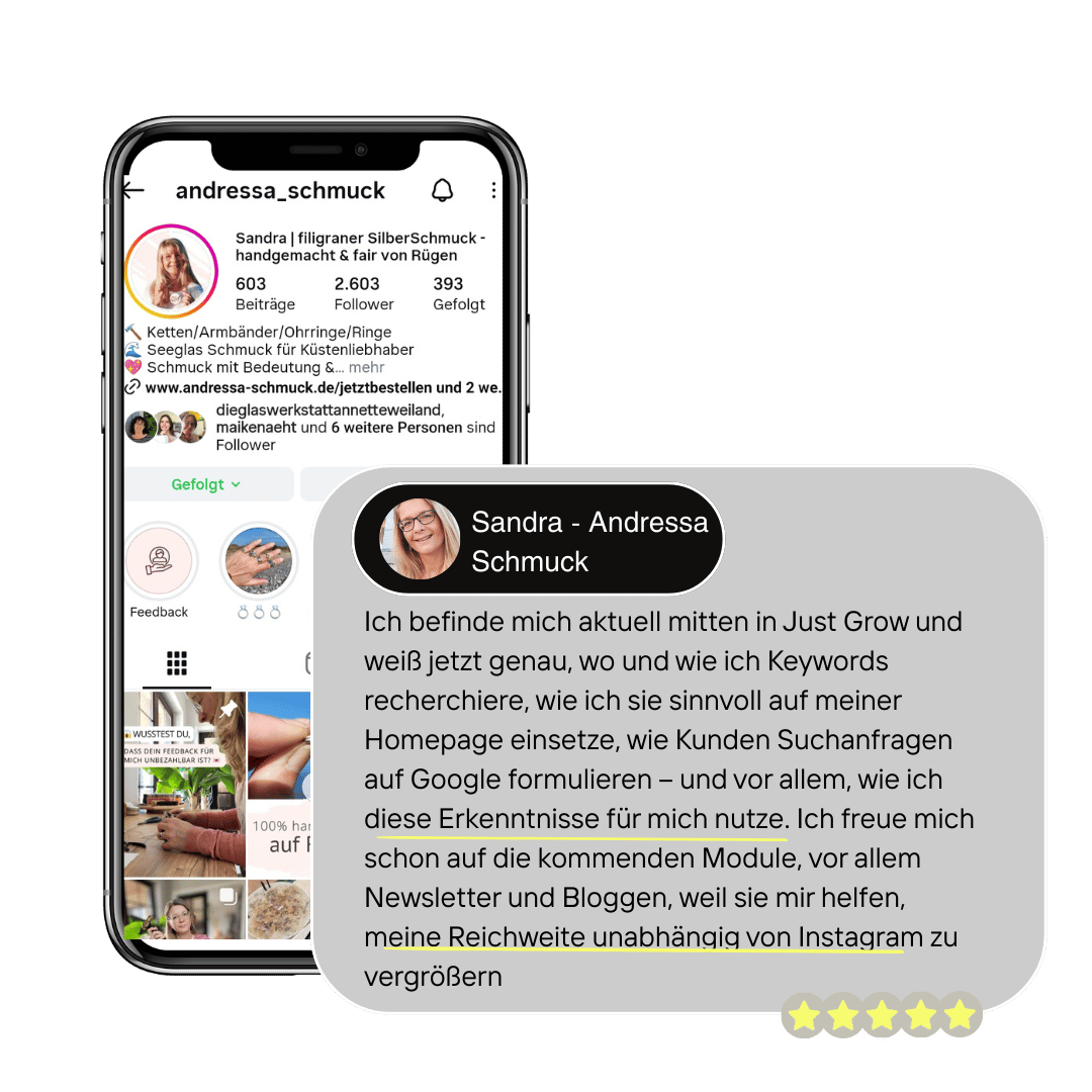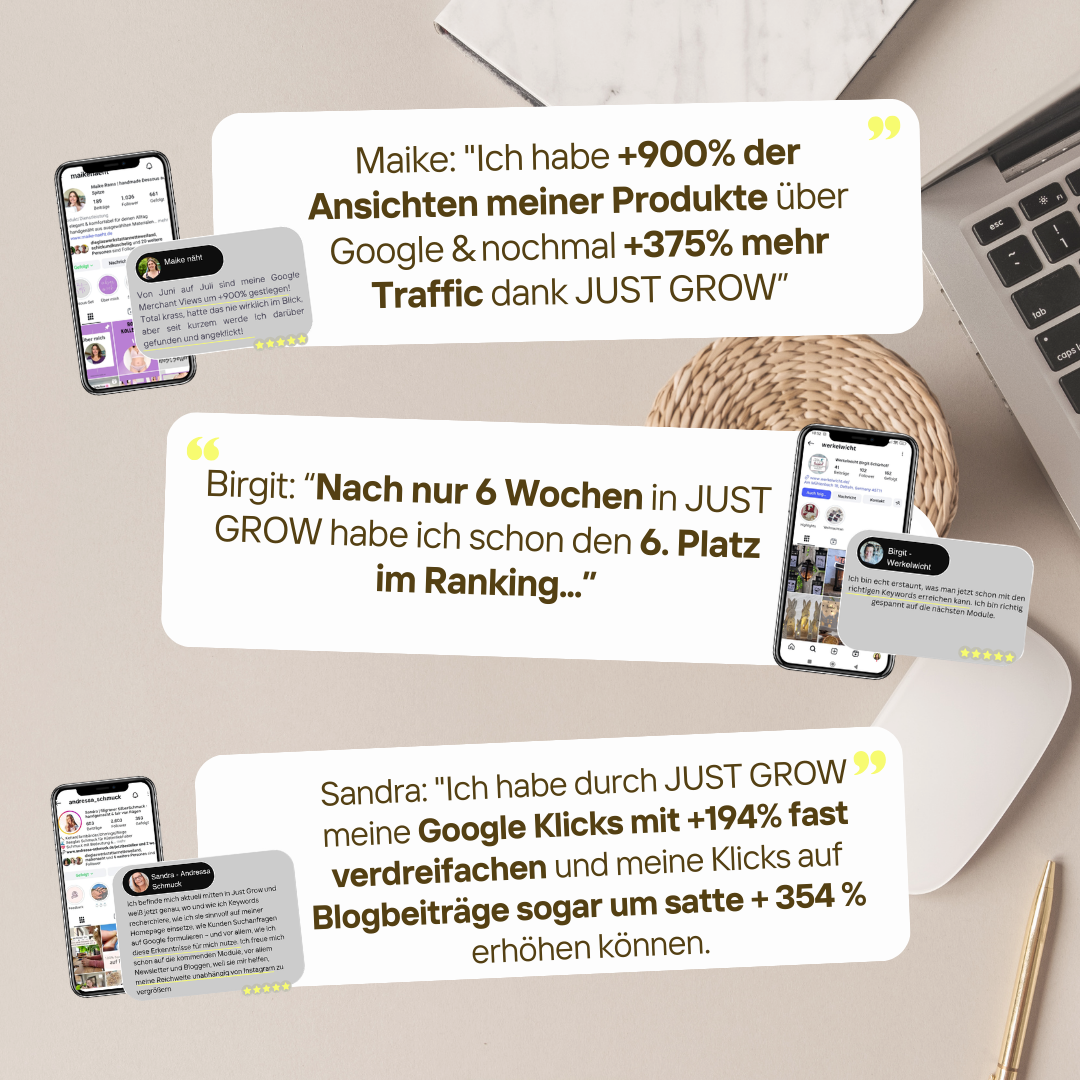 Volle Transparenz: Die Kundenstimmen sind aus dem "Mutter-Kurs" JUST GROW - Die SEO Inhalte sind identisch